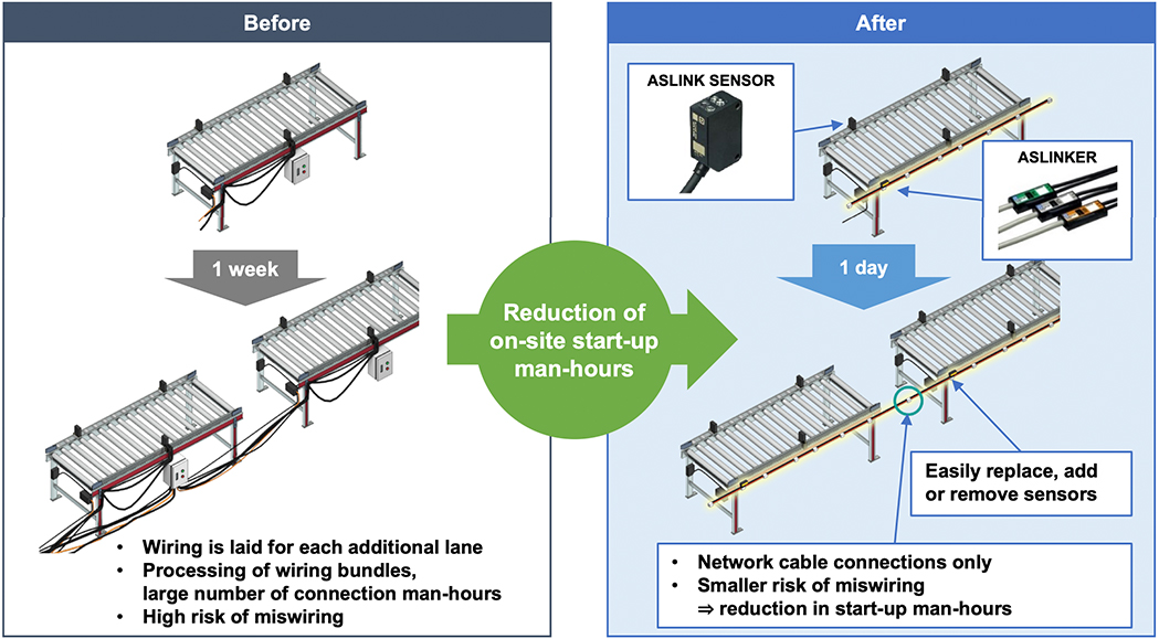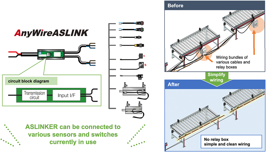 | Reduction of line start-up man-hours | AnyWireASLINK simplifies wiring and eliminates the need for relay boxes which leads to reduction of miswiring, easy start-up and expansion of lines. |