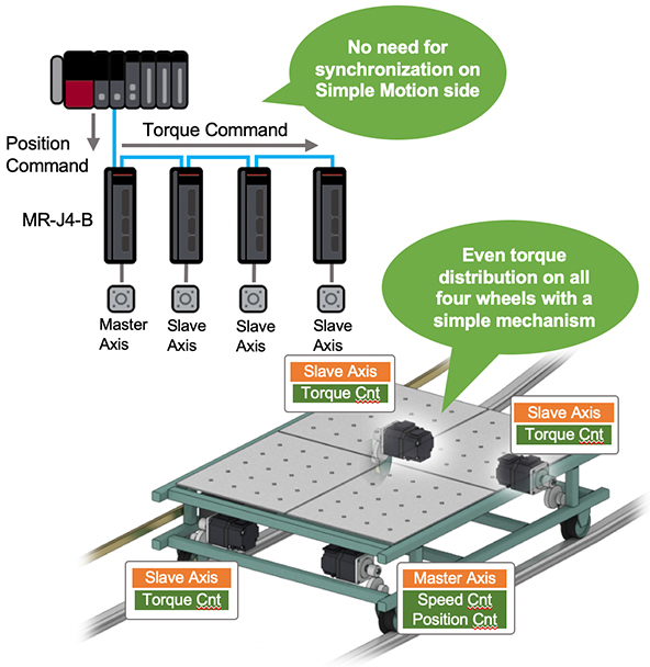 Since the MR-J4-B can transmit the same torque data from the master axis to the slave axis through driver communication, multi-axis torque sharing operation is possible