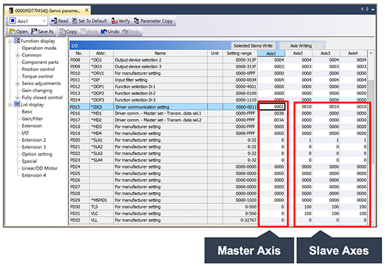 Set servo parameters corresponding to master and slave axes with engineering tool MELSOFT GX Works3.
