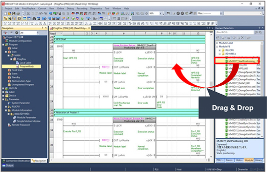 With engineering tool MELSOFT GX Works3, you can create a program simply by dragging and dropping the necessary FB from the unit FB or registered FB provided on FA site to the editor screen.