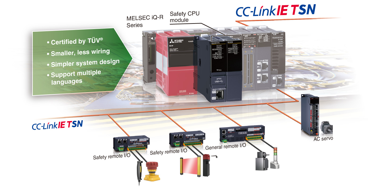 Mô-đun CPU an toàn cho phép kiểm soát cả chương trình thông thường và chương trình an toàn trên cùng một mô-đun, và dễ dàng lập trình nhờ các tính năng trực quan của phần mềm kỹ thuật GX Works3. Cả dữ liệu điều khiển thông thường và dữ liệu điều khiển an toàn đều có thể được truyền chung trên CC‑Link IE TSN, hiện thực hóa một hệ thống tích hợp giữa điều khiển chung và điều khiển an toàn.