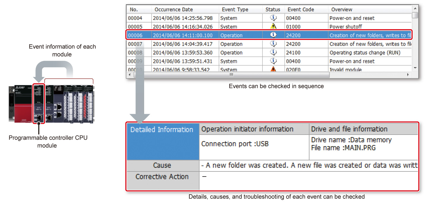 - Các thay đổi thực tế đối với chương trình và các sự kiện hệ thống với mã sự kiện tương ứng có thể được hiển thị theo thứ tự, cho phép xác định nguyên nhân lỗi và khắc phục sự cố kịp thời