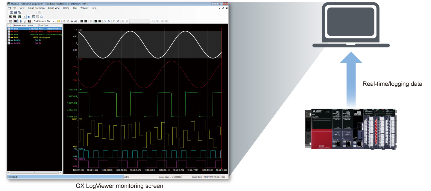 - Với chức năng giám sát theo thời gian thực của GX LogViewer, các thay đổi nhỏ trong thiết bị mục tiêu có thể dễ dàng được xác định, điều này hữu ích cho việc truy xuất nguồn gốc trong nhà máy, khởi động thiết bị và gỡ lỗi trong trường hợp có lỗi