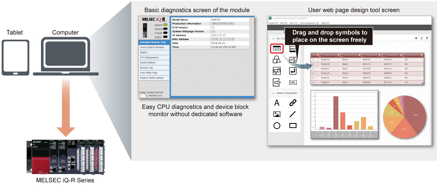 - Chức năng máy chủ Web tích hợp trong CPU cho phép truy cập dễ dàng vào chẩn đoán CPU và giám sát lô thiết bị qua trình duyệt web trên PC hoặc máy tính bảng mà không cần tạo đồ họa