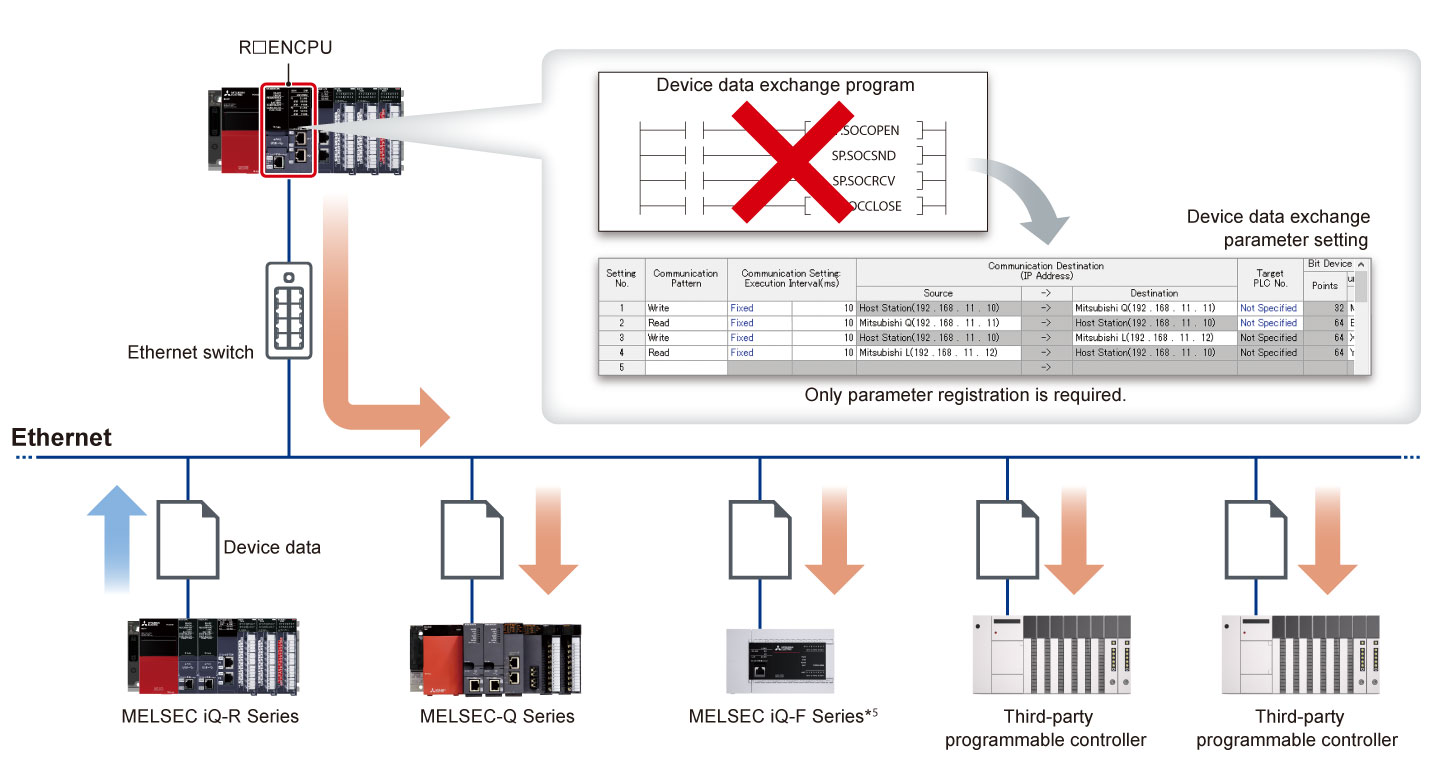 - Mô-đun CPU của bộ điều khiển lập trình cho phép trao đổi dữ liệu thiết bị bằng cách đăng ký tham số với các bộ điều khiển lập trình Mitsubishi Electric và các bộ điều khiển lập trình bên thứ ba *3 (chức năng giao tiếp CPU đơn giản) *4