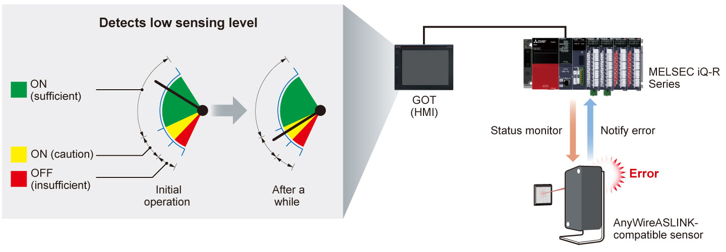 - Mức độ cảm biến của các cảm biến có thể được giám sát từ bộ điều khiển lập trình và GOT (HMI)