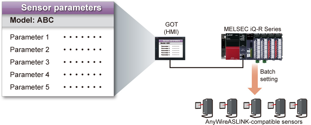 - Các cảm biến thông thường cần được điều chỉnh từng cái một trên khu vực sản xuất. Hệ thống AnyWireASLINK cho phép nhiều cảm biến được thiết lập theo lô từ bộ điều khiển lập trình, giảm đáng kể thời gian cài đặt cảm biến