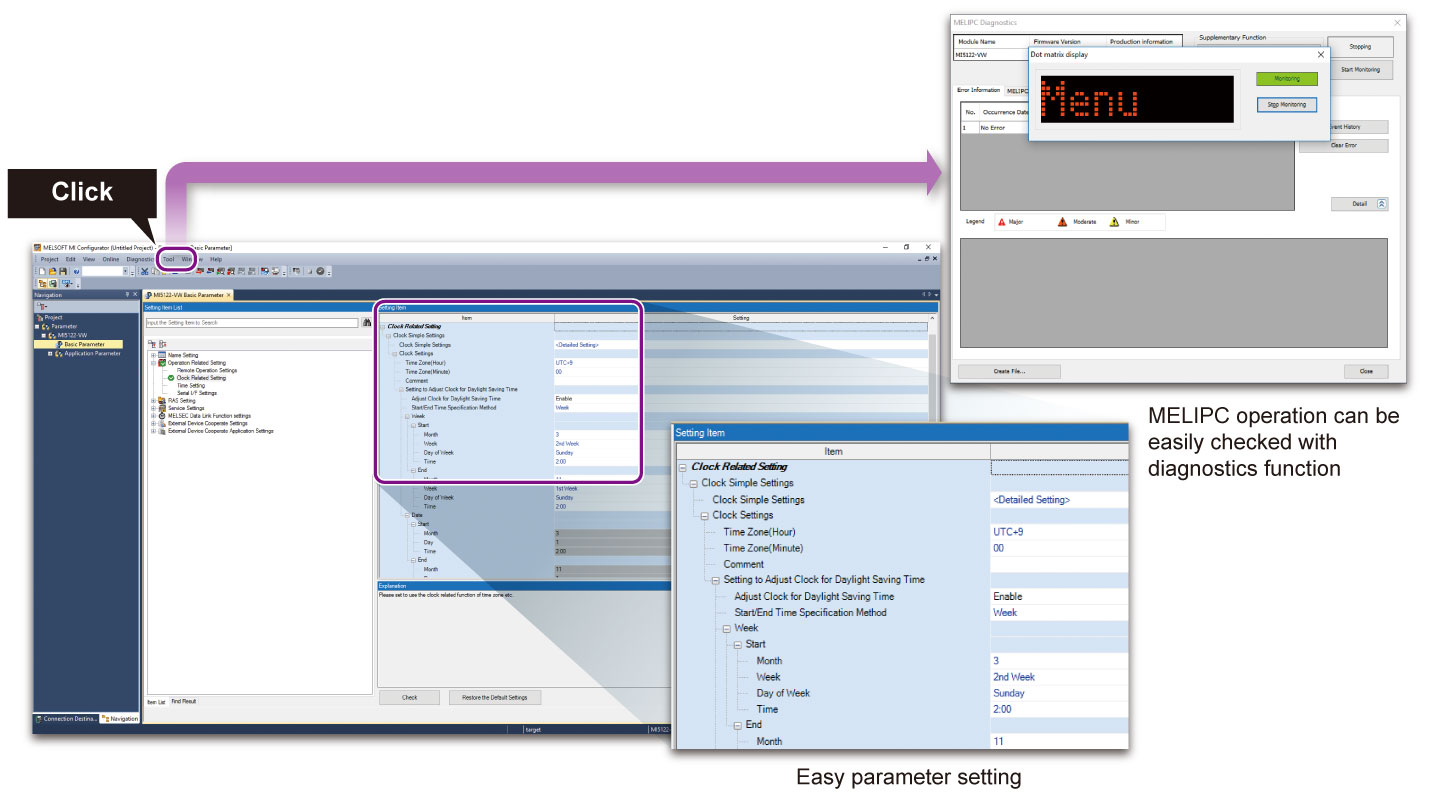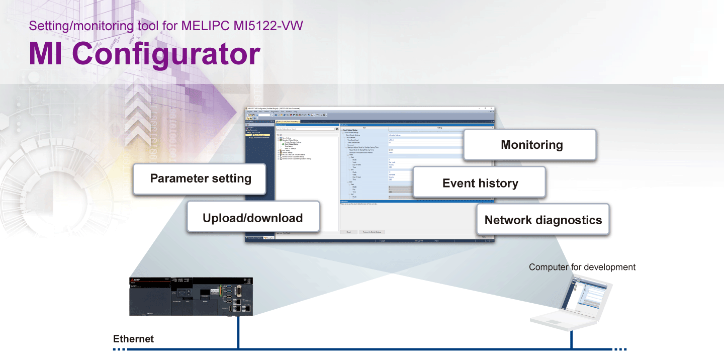 MI Configurator là phần mềm bao gồm nhiều tính năng như cài đặt tham số, chẩn đoán, giám sát và kiểm tra cho MELIPC. Các mục tham số được phân loại theo mục đích, cho phép hiển thị các mục cài đặt cần thiết một cách ưu tiên. Các tham số mục tiêu có thể dễ dàng được tìm thấy, giảm chi phí thực hiện.