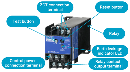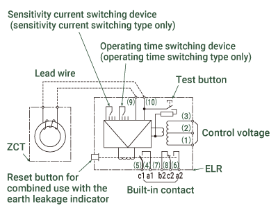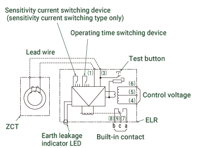 Một ZCT (biến dòng không pha) được sử dụng kết hợp với một rơ le. ZCT phát hiện dòng rò, sau đó rơ le gửi tín hiệu.