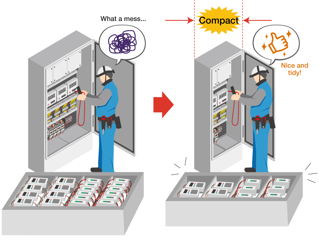 Việc lắp đặt dây điện cho các máy cắt điện và thiết bị đo độc lập được loại bỏ, cho phép giảm kích thước bảng phân phối, rút ngắn thời gian xây dựng và giảm chi phí xây dựng.