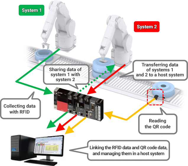 - Dữ liệu có thể được truyền giữa các hệ thống bằng cách gắn các đầu đọc RFID (antenna) vào băng tải và các bộ phận khác của hệ thống, và gắn các thẻ RFID vào các pallet mang theo hệ thống.