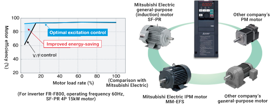 Các đặc tính đầu ra tối ưu (đặc tính V/F) có thể được chọn để phù hợp với ứng dụng và đặc tính tải, và bộ biến tần tự động tối ưu hóa điều khiển động cơ mà không cần thiết lập tham số chi tiết. Ngoài ra, nó còn có chức năng tự động điều chỉnh tích hợp, đo lường hằng số mạch của động cơ, cho phép điều khiển động cơ ổn định ngay cả khi chiều dài dây nối dài hoặc có sự khác biệt giữa các động cơ riêng lẻ. Hơn nữa, việc sử dụng chế độ điều khiển kích thích tối ưu cho phép đạt hiệu suất động cơ tối đa, giảm thiểu tổn thất động cơ không cần thiết, tối ưu hóa mức tiêu thụ điện năng và đạt được hiệu quả chi phí tốt.