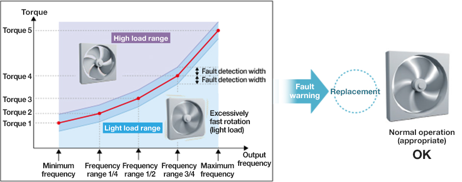 Người dùng có thể lưu trữ mối quan hệ giữa tốc độ và mô-men xoắn mà không gặp sự cố, so sánh điều kiện tải hiện tại với các đặc tính lỗi đã lưu, và xuất ra thông báo lỗi/cảnh báo khi vượt quá phạm vi bình thường. Hệ thống có khả năng phát hiện các bất thường như tắc nghẽn bộ lọc và đứt dây curoa, giúp việc bảo trì trở nên dễ dàng hơn.